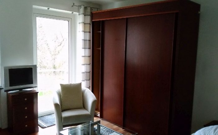 Diese hochwertige und voll möblierte Ein-Zimmer-Wohnung in begehrter und ruhiger Wohnlage bietet auf einer  Wohnfläche von ca. 32 m² alles, was man zum Wohnen braucht. Der Wohnbereich mit einer offenen Küchen-Nische ist möbliert mit einem Schlafsofa, Couchtisch, Schränken und einer kleinen Sitzecke. Die weiße Einbauküche ist mit allen notwendigen Elektrogeräten ausgestattet und ein zusätzlicher Einbauschrank unter dem Fenster bietet weiteren nützlichen Stauraum. Vom Wohnbereich gelangt man auf den Balkon mit Blick in den Garten. Alles inklusive für eine Warmmiete (exklusive Strom) von 375 Euro. Hier braucht man nur seine „Sieben Sachen“ einpacken und kann sofort einziehen.